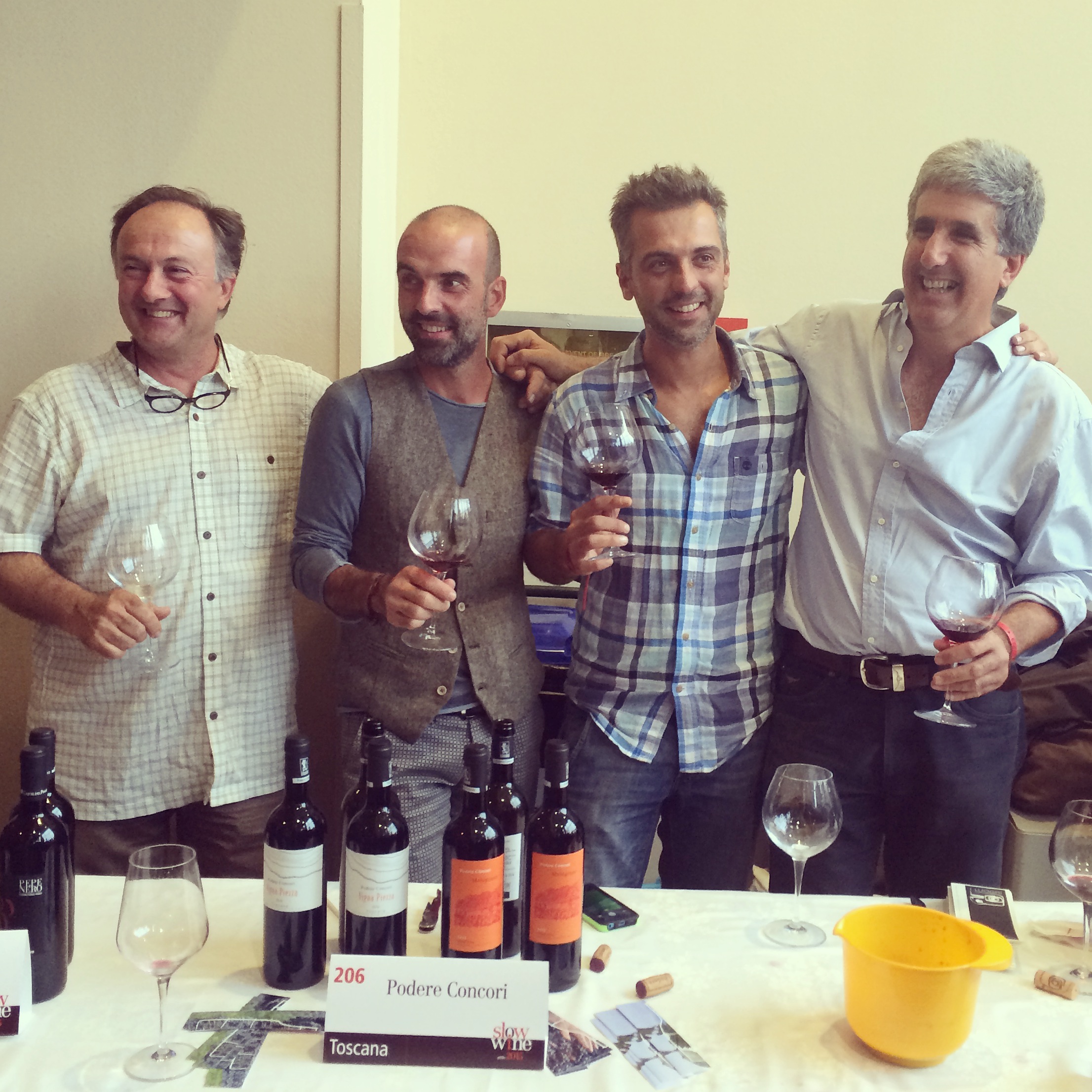 Alla presentazione della guida Slow Wine a Torino abbiamo incontrato tanti vecchi amici. Ecco un quartetto di viticoltori della Lucchesia che stimiamo per tutto quello che fanno: da sinistra Giuseppe Ferrua di Fabbrica di San Martino, Gabriele da Prato di Podere Còncori, Mauro Montanaro di Agricola Calafata e Saverio Petrilli di Tenuta di Valgiano.